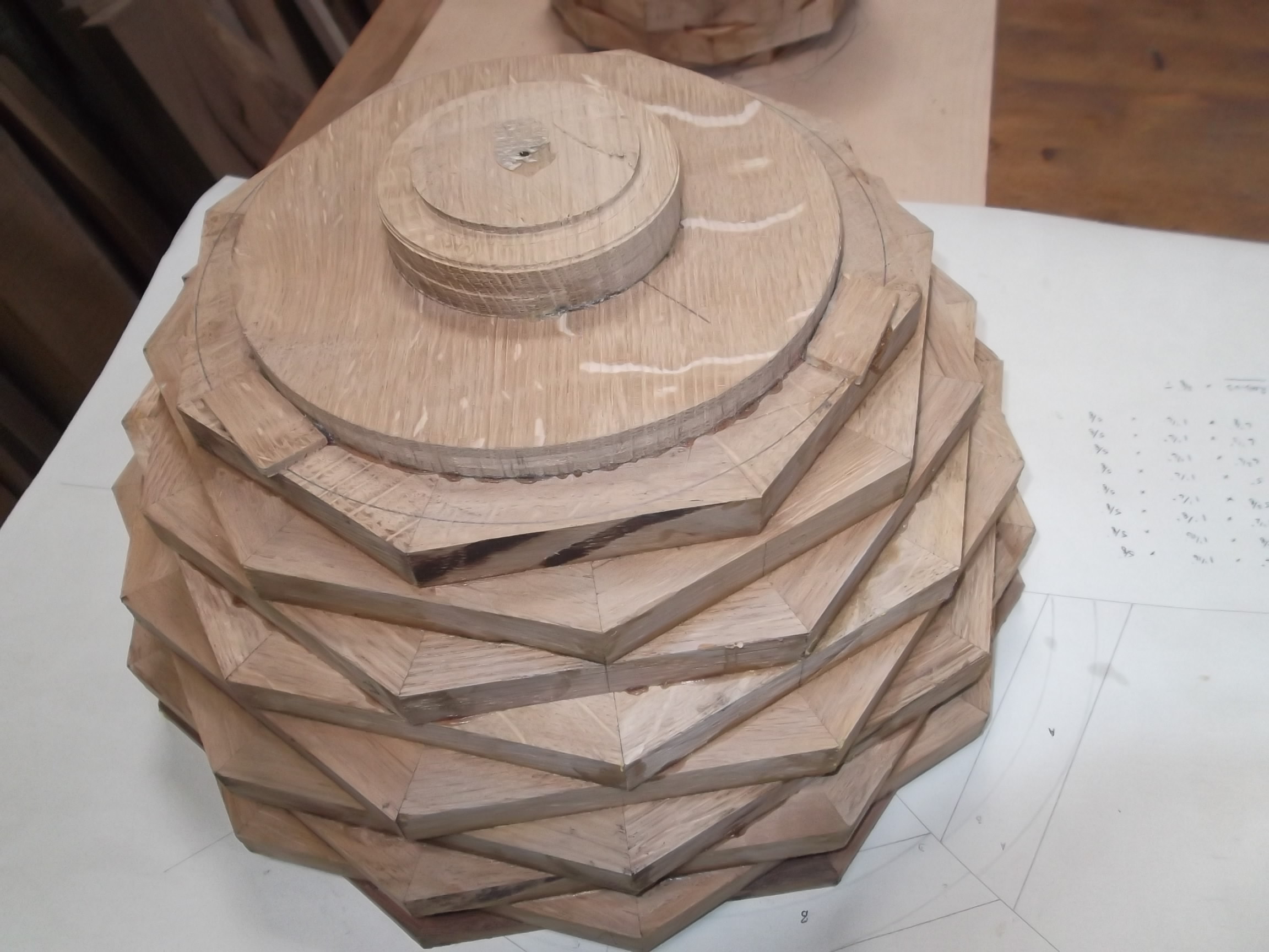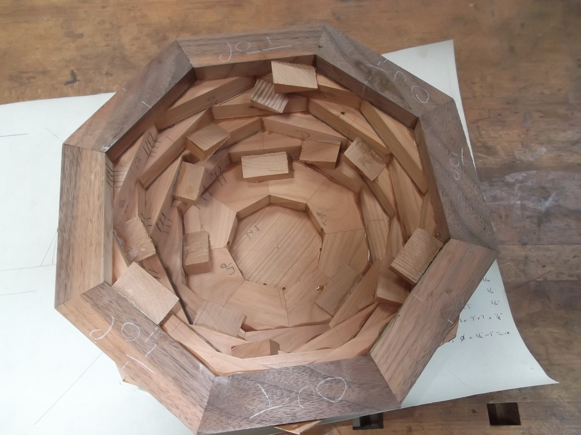 If I wanted to make a bowl five inches high, for example, I would create five one inch thick layers. Each layer is an octagon, with each of the eight pieces mitred to match its neighbour. These eight pieces are glued end-to-end to create a single layer/ring. The rings are then glued to the ones above and below them. The bottom is made from three thin sections of wood glued together; the grain of the middle piece runs in the opposite direction to the two outer layers. This is the principle of plywood: thin layers in opposing directions counteract the tendency of wood to move, and then split. The Romans made their shields this way – look at their successes!